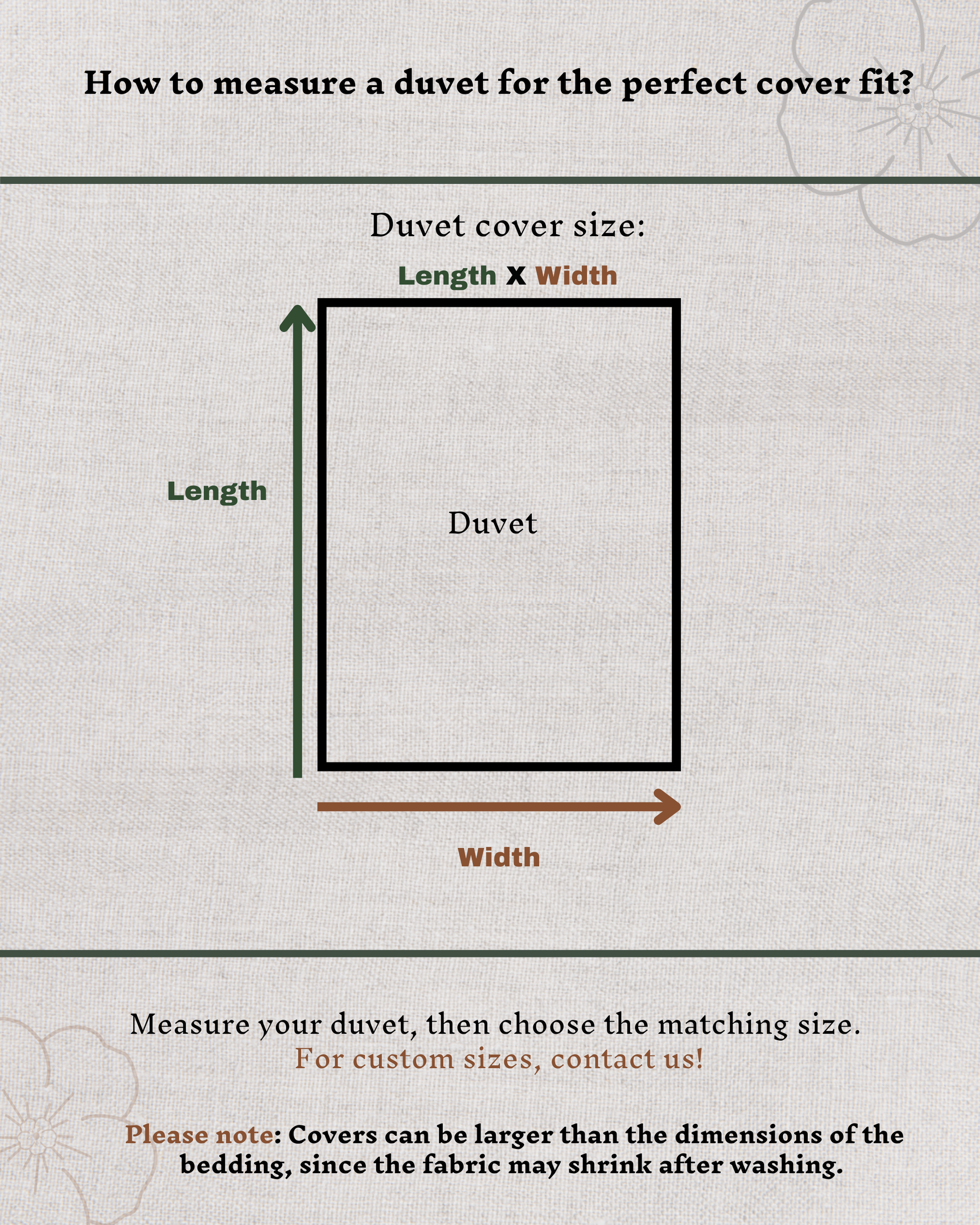 Not sure about sizing? Submit a Custom Size Request before ordering. We’ll confirm your duvet’s exact width and length to ensure the best fit.